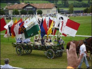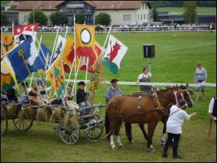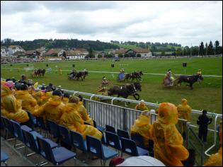 Neben ernsthaften Flachrennen gibt es am Marché-Conocurs auch fröhliche ländliche Rennen, bei denen sich Jugendliche ohne Sattel und ohne Steigbügel gegenseitig zeigen, was Reiten heißt. Und richtig fahren kann der, der einen Brütschiwagen im Zweispänner als erster ins Ziel bringt. Doch ganz heftig geht es beim Fahren mit römischen Streitwagen zu und her. |