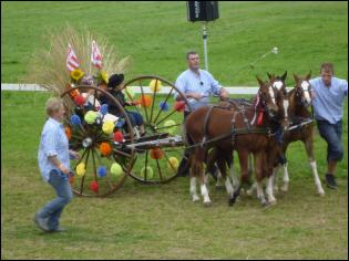 Neben ernsthaften Flachrennen gibt es am Marché-Conocurs auch fröhliche ländliche Rennen, bei denen sich Jugendliche ohne Sattel und ohne Steigbügel gegenseitig zeigen, was Reiten heißt. Und richtig fahren kann der, der einen Brütschiwagen im Zweispänner als erster ins Ziel bringt. Doch ganz heftig geht es beim Fahren mit römischen Streitwagen zu und her. |